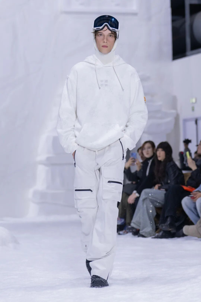 怀旧色调渐渐过渡至纯白雪景,来到主秀场,视野被辽阔的雪场景观无限放大,冬季运动竞技场跃现眼前。取自专业滑雪赛道与运动员舒展姿态的动态轨迹与空间张力,令秀场氛围更加真实而沉浸。