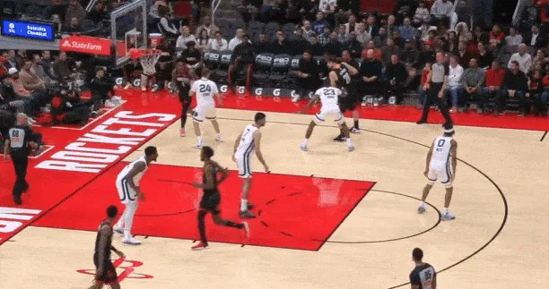 阿门推进过半场后立即持球和谢泼德、卡佩拉发动“Middle Zoom”,手递手交球后外拆至三分线外获得空档,接谢泼德回传的同时立即启动突破吸引双人防守,随即中转给同侧底角空位的伊森。